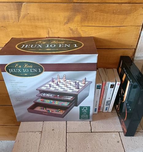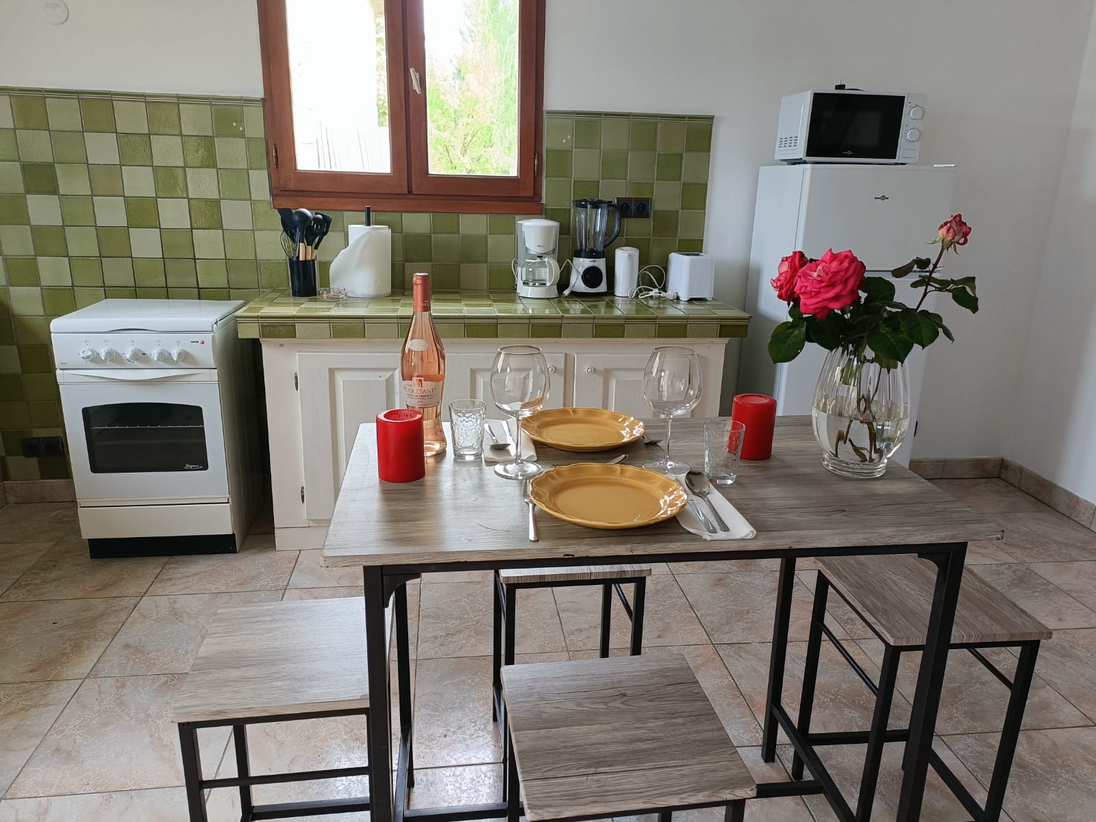 TV, gazinière (four + feux), micro-ondes, cafetière, grille-pain, bouilloire, poêles, casseroles, assiettes et couverts, étendoir à linge, fer à repasser … Autres ustensiles tels que blender, batteur électrique, mixeur.