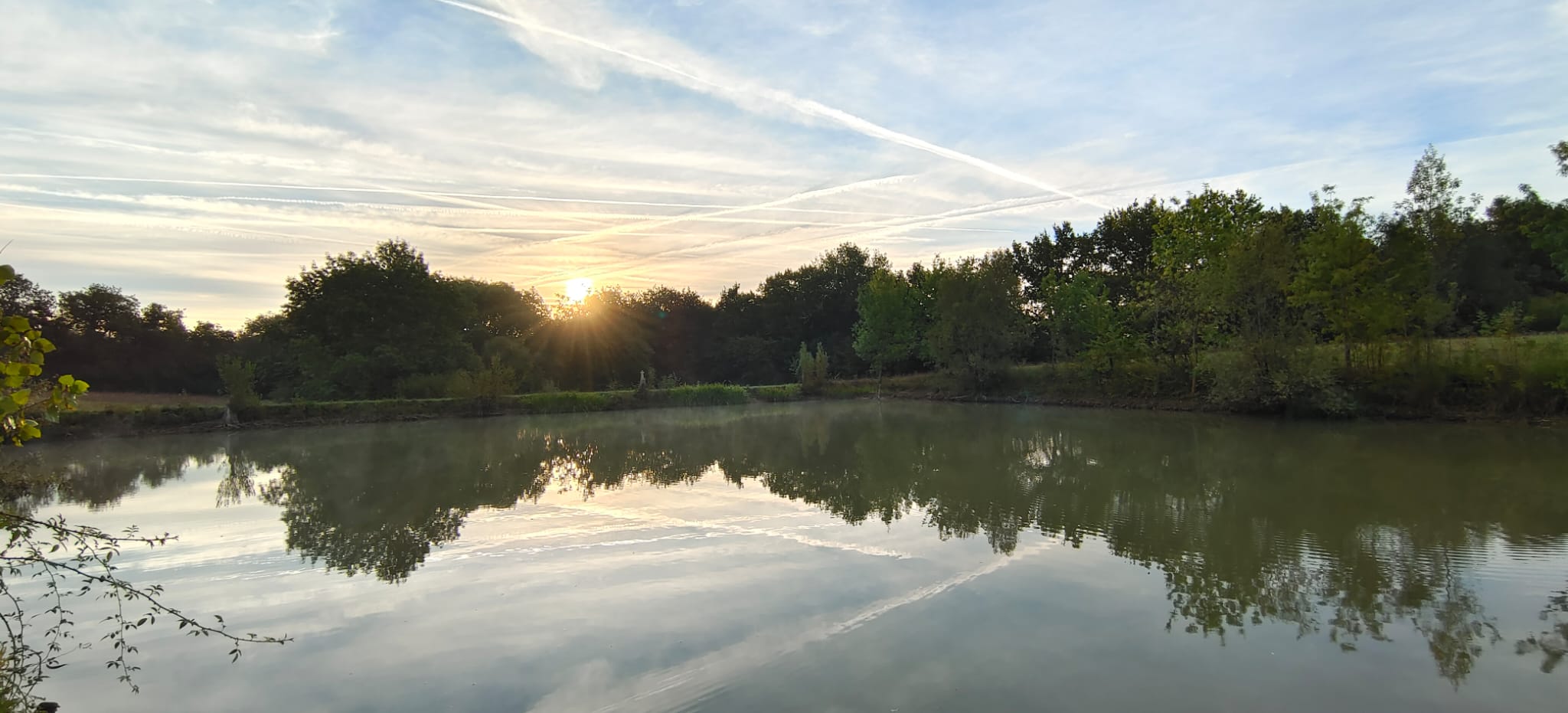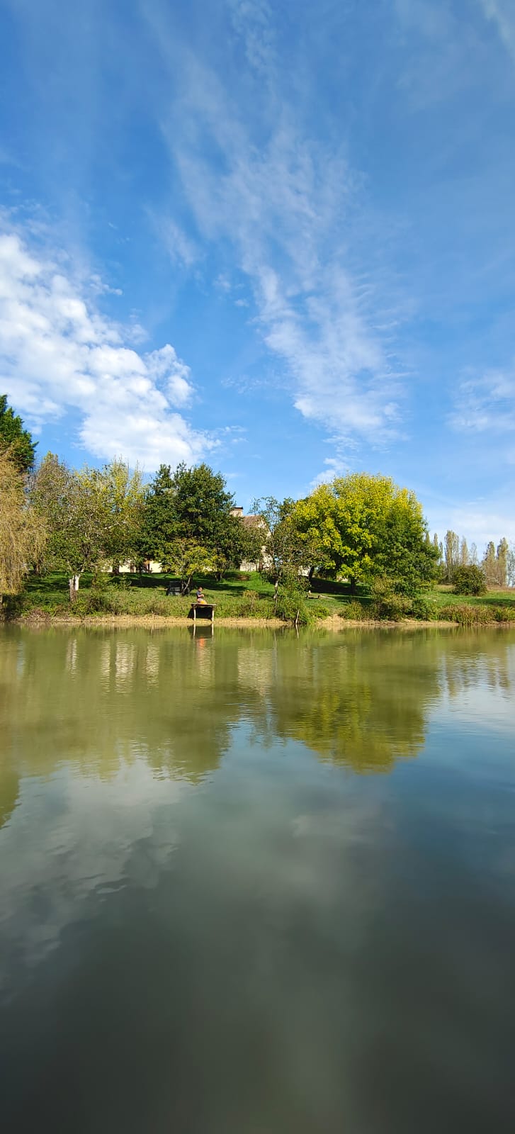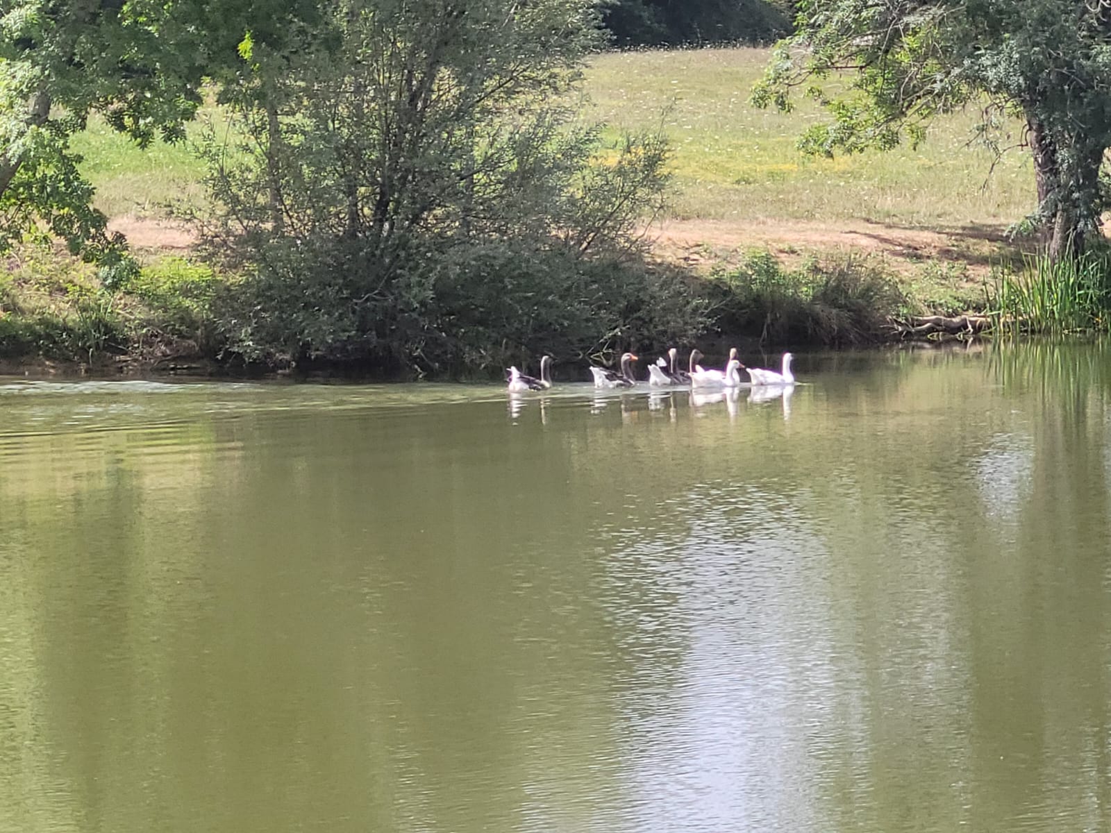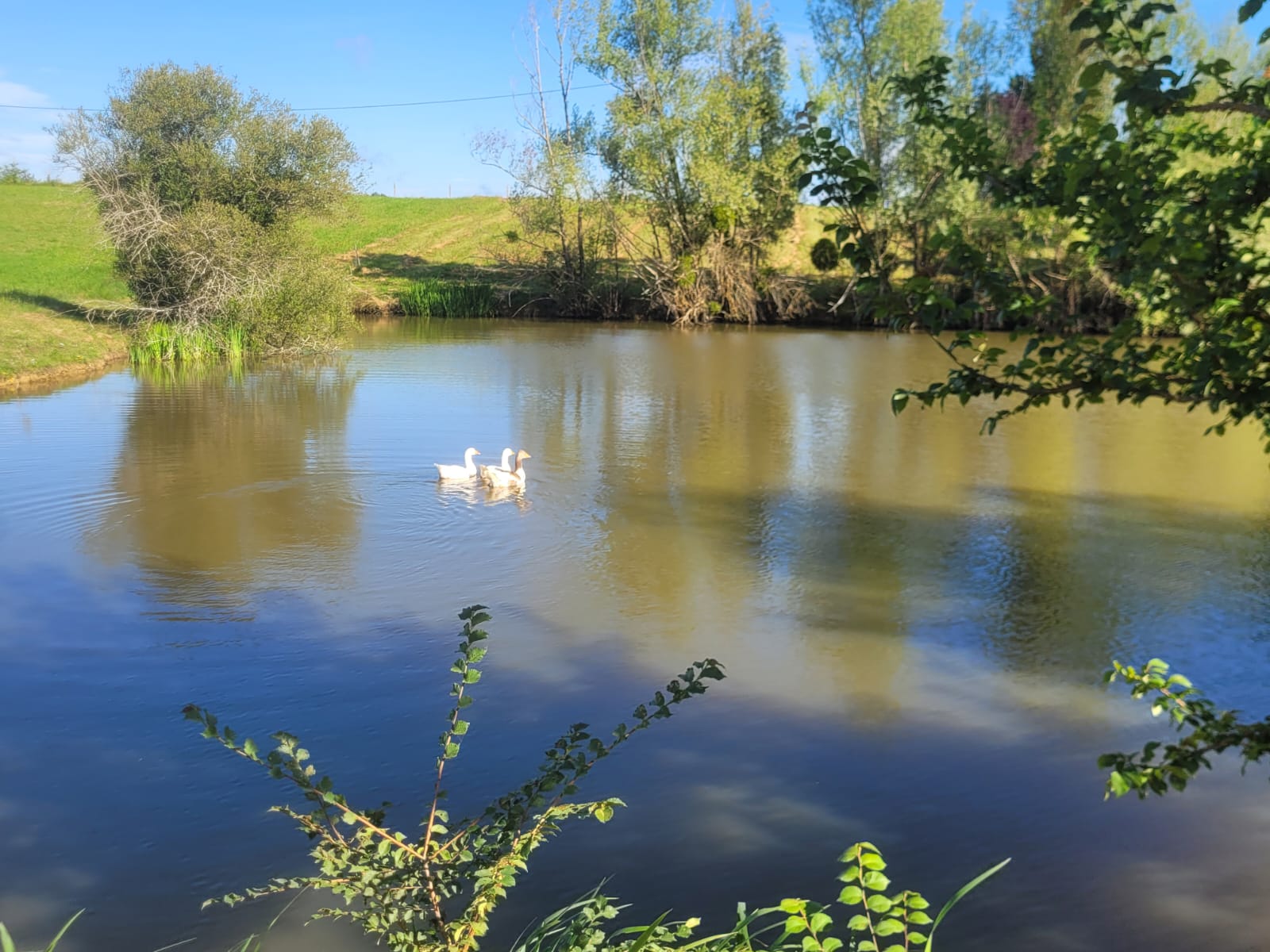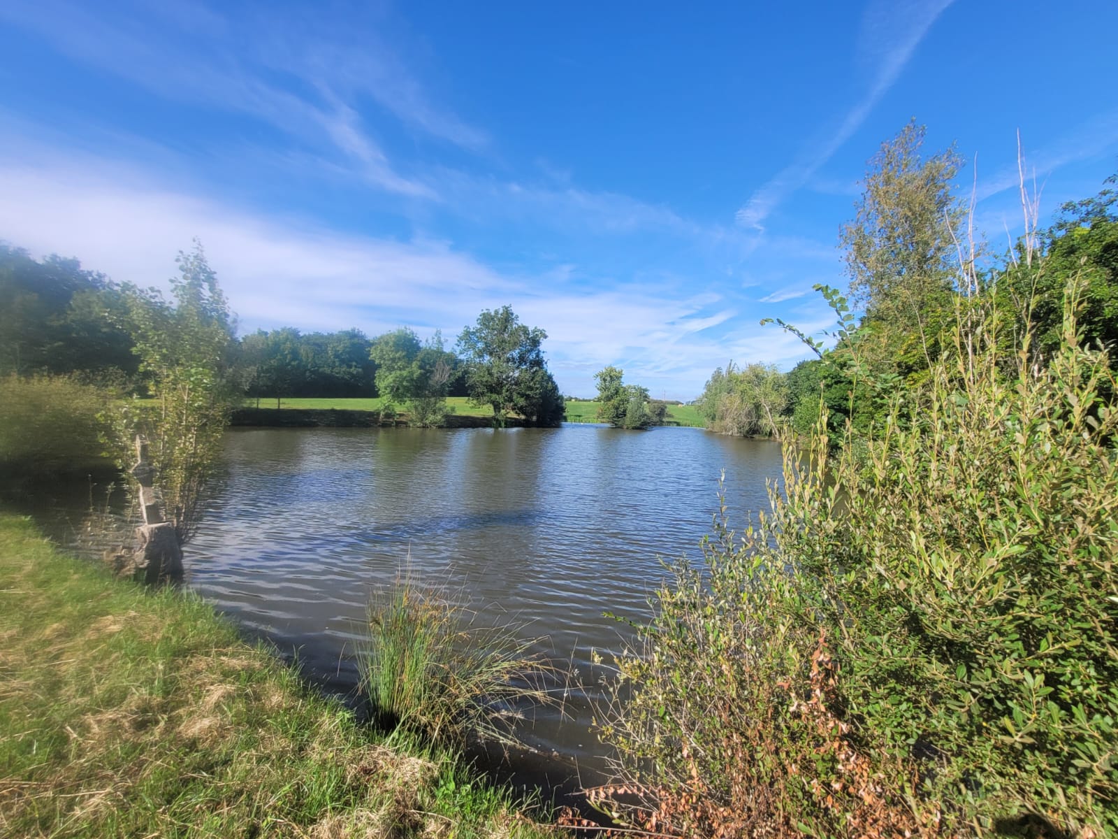 Très calme, sur propriété en campagne (15 ha) avec deux grands étangs privés pour pêche (dont black bass) et forêt privée.